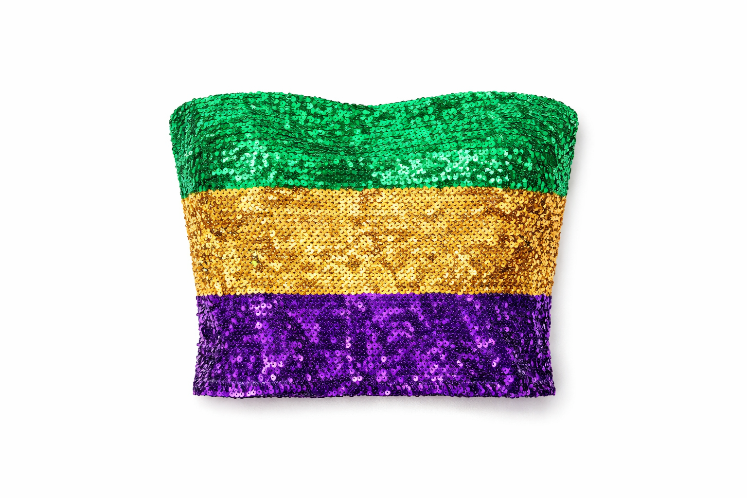 Whether you’re styling it with denim shorts, jeans, or a statement skirt, this top is a Mardi Gras must-have.